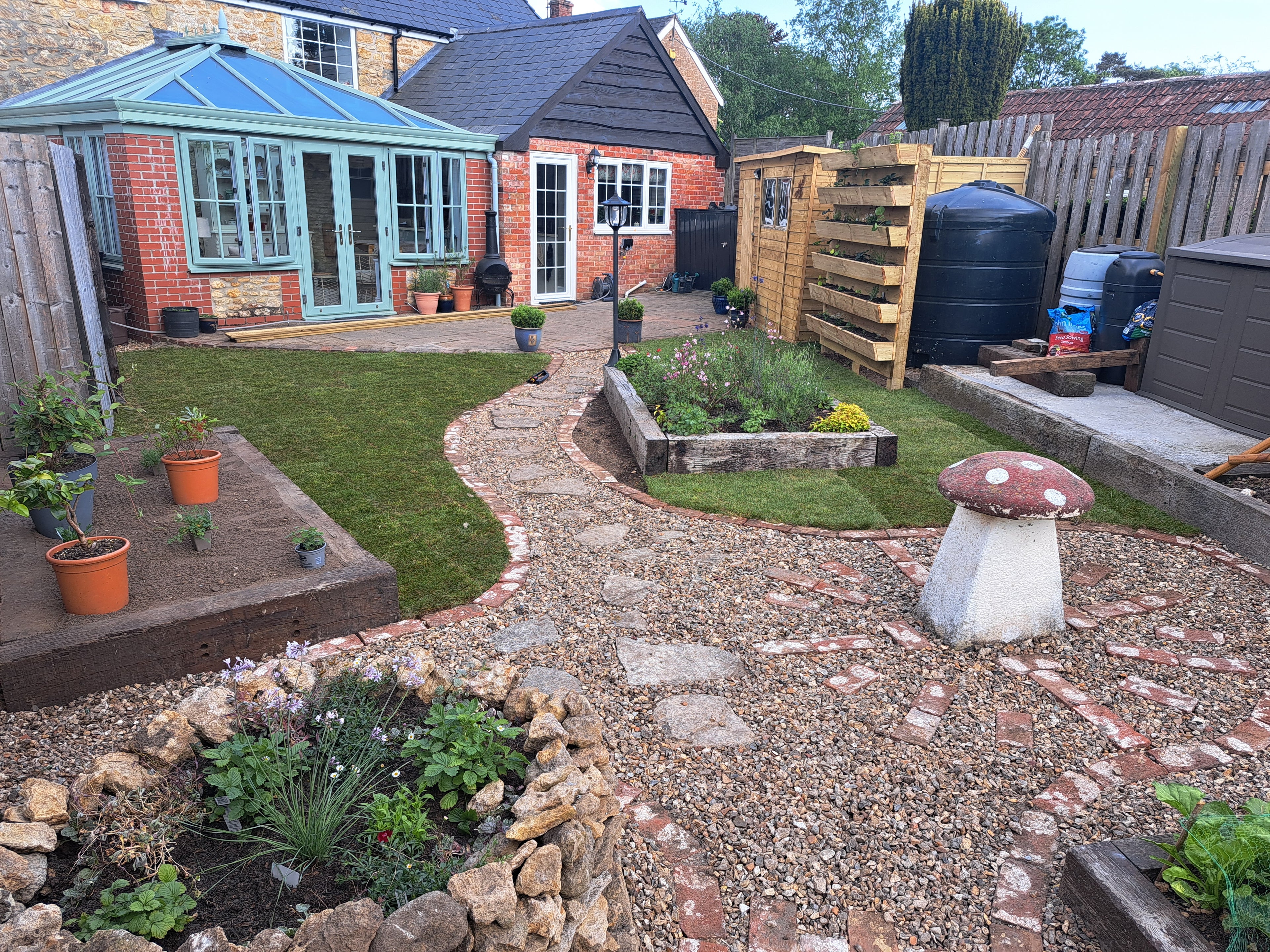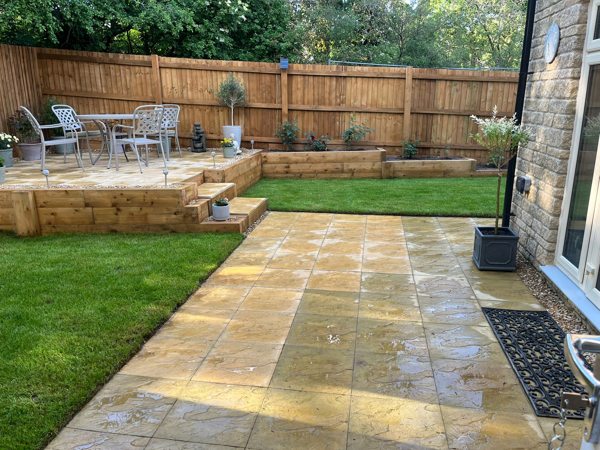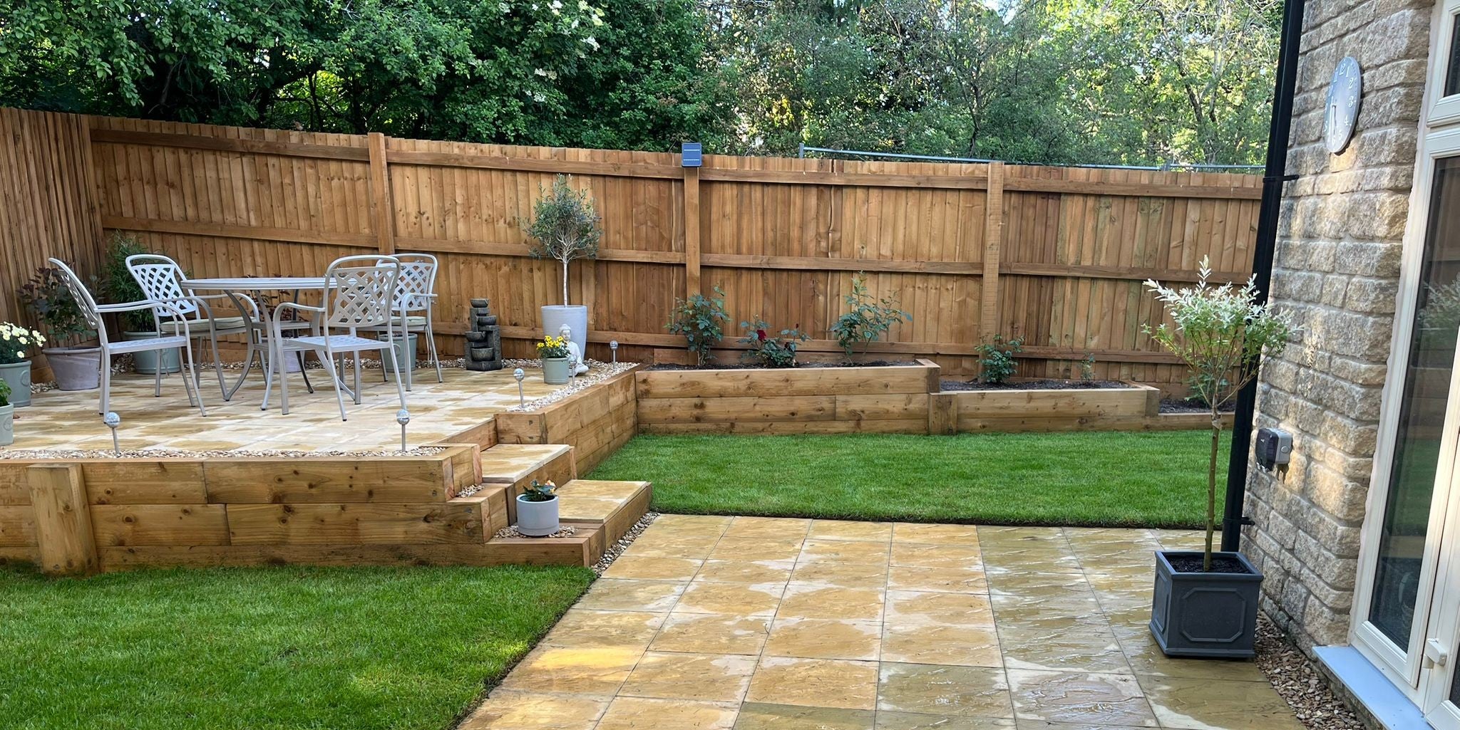 James came up with a great design which flattened our garden whilst embracing the existing tiered fences with a raised patio and sleeper-flower beds. He put in drainage under the ground which we didn’t even think to ask for.