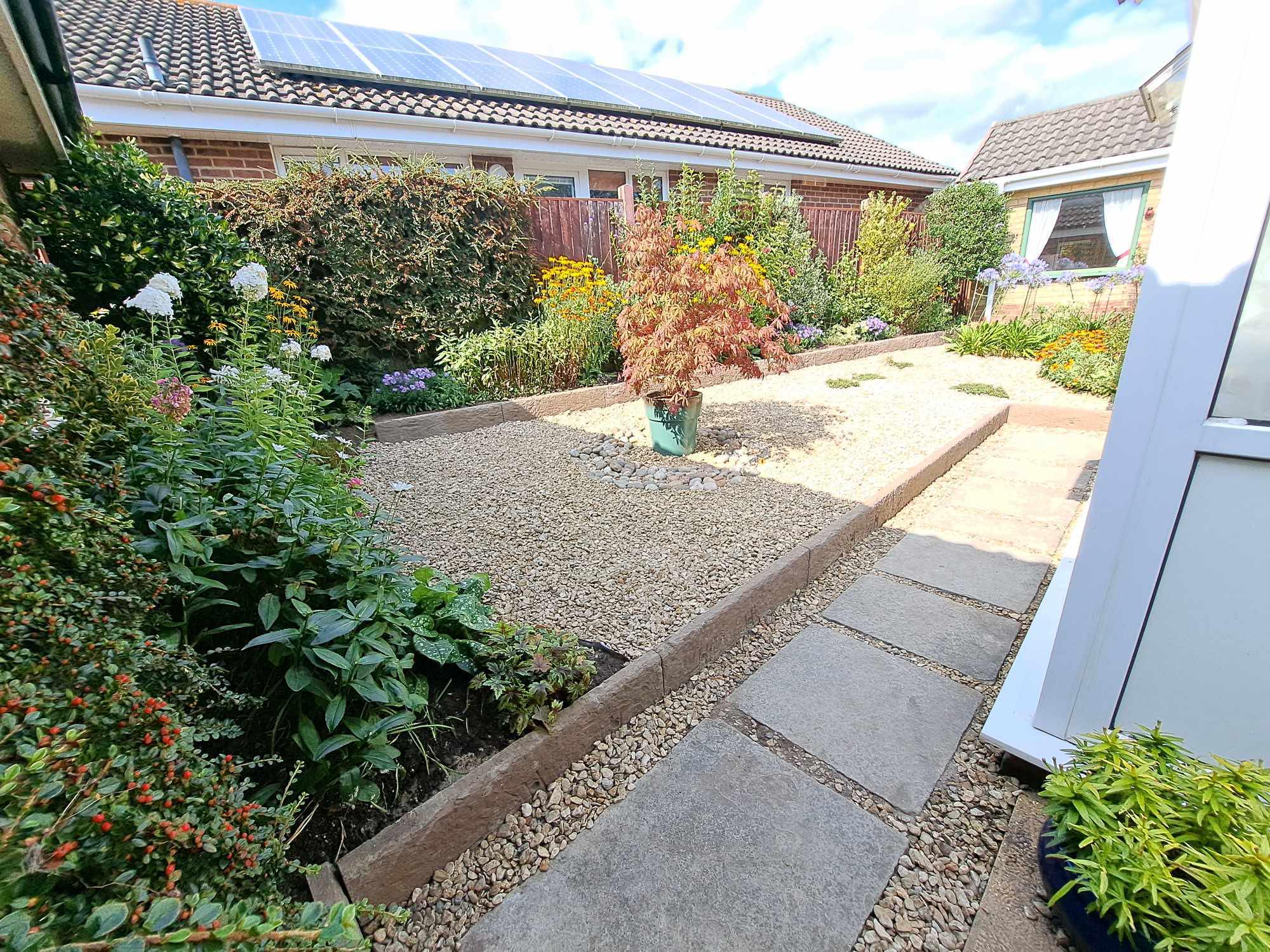 James came up with a great design which flattened our garden whilst embracing the existing tiered fences with a raised patio and sleeper-flower beds. He put in drainage under the ground which we didn’t even think to ask for.